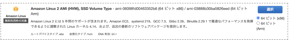 今回は以下のAmazon Linux2 AMIを選択する。