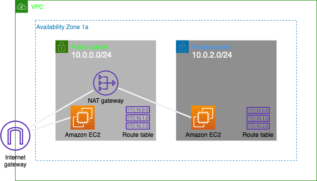 ※プライベートEC2にはパブリックEC2を踏み台にしてログインする事として、プライベートからのインターネット接続は、NAT gatewayを経由する事とする。