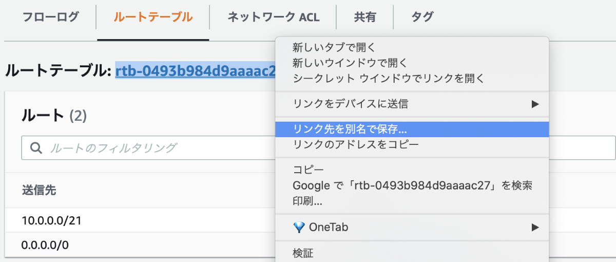 作成したサブネットをクリックし、下部にあるルートテーブルを表示させ、IDを右クリックして新しいタブで開く