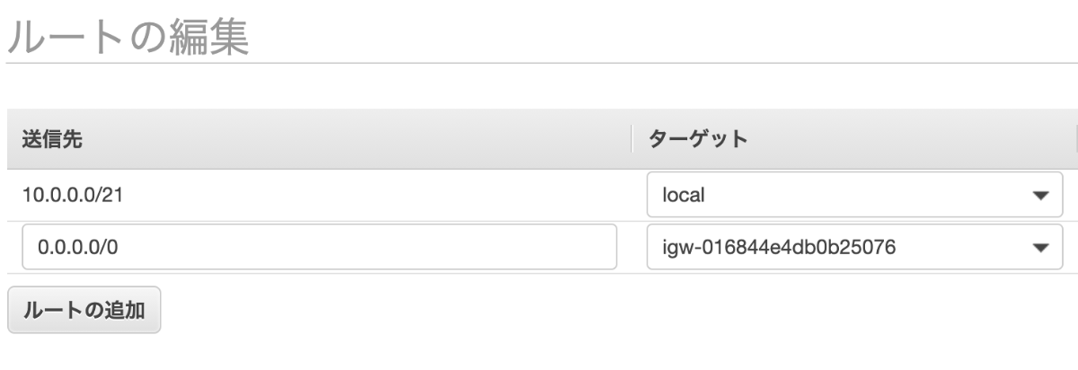 送信先を0.0.0.0/0としてターゲットを作成したインターネットゲートウェイに設定する。