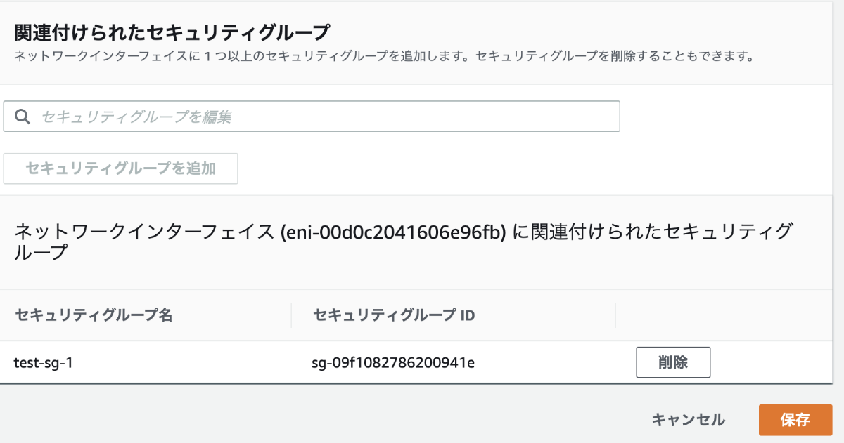 デフォルトのセキュリティグループは削除し、作成したセキュリティグループを追加する。