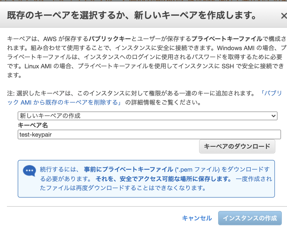 最後に起動ボタンをクリックするし、新しいキーペアを作成し、ダウンロードする。