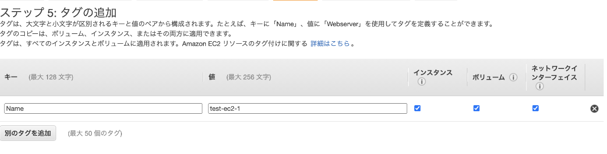 タグとしてNameにtest-ec2-1と名前を付ける。