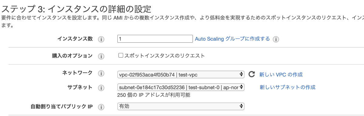 ※今回は自動割り当てパブリックIPを有効にしパブリックIPが割り当てられるようにする。