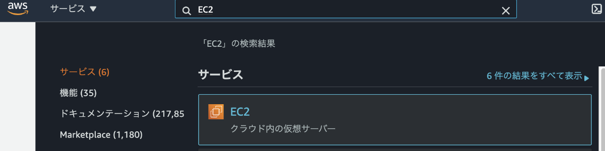 AWSマネジメントコンソールの上部検索でEC2を検索して開く