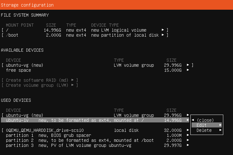ubuntu-lvというのを14.996Gから29.996Gに変更する