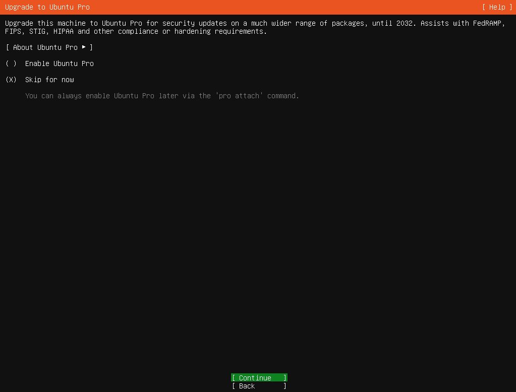 Ubuntu Proというサブスクリプションができているらしい。個人でも5台までは無償で入れるらしいが、とりあえずスキップで。