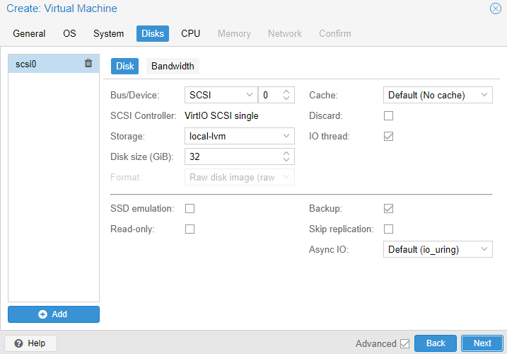 CPUの設定。PCは 6 core, 12 threadなので、Proxmoxからは 12 coreに見えている。