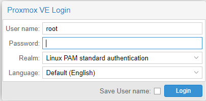 httpsで Proxymoxのアドレス:8006 にアクセスすると管理画面に行ける。インストール時に指定したIPアドレスを入れる。