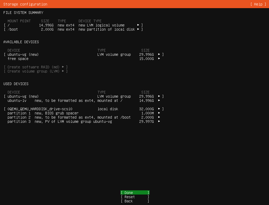 ディスクパーティション。仮想ディスクが32GB(29.996G)なのに、2 + 15 = 17 GBしか使っていない。残り15 GBはLVMの未使用領域として残してある。拡張性という意味ではいい設計かもしれないけど、仮想ディスクなので全部OSから見えるようにしてあげる。