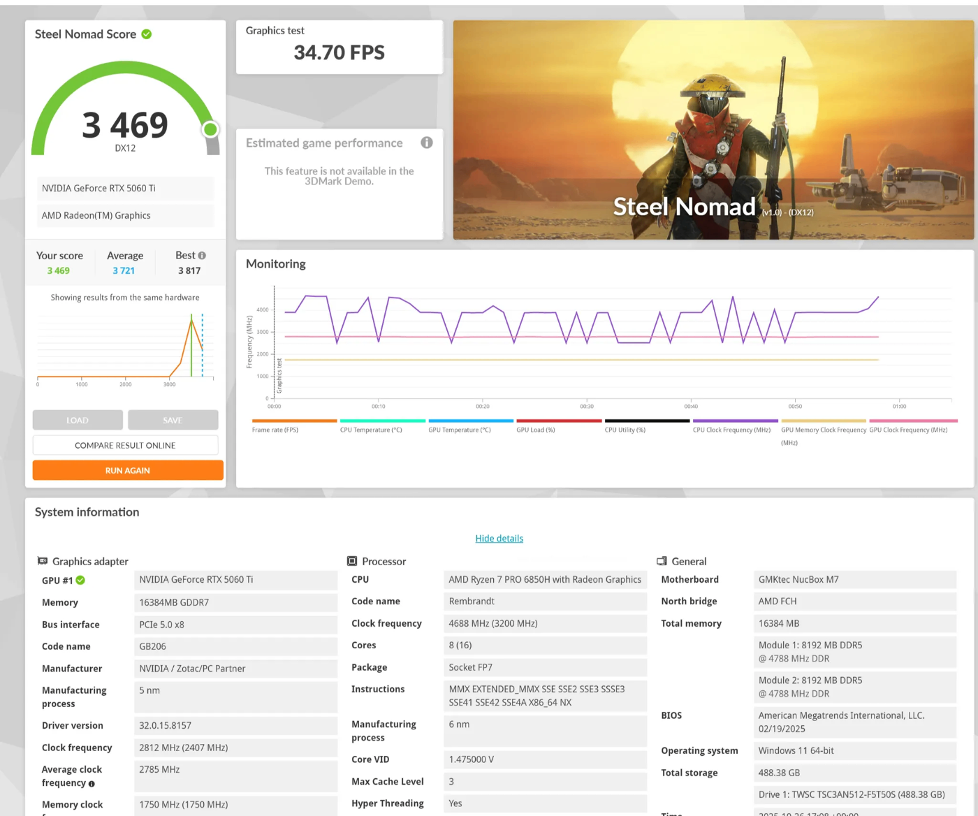 グラフィック性能は上がったものの、34FPSで、最新世代のGPUを使った割には思ったほどのパフォーマンスではなかったです。後ほど詳細に書きますが、OCuLink でGPUを接続したので、最新世代のGPUを使ってもこの程度の結果となったものと思われます。