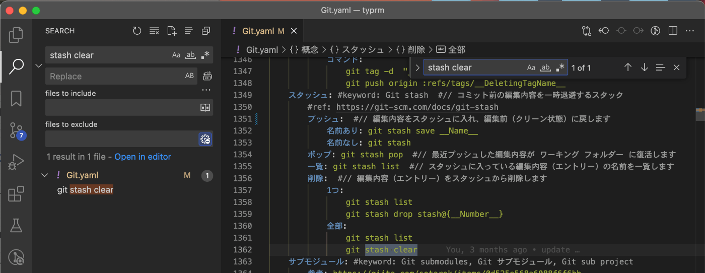 しかし、全文検索機能を使って複数の単語を検索すると、単語の順番が合っていないとヒットしないですし、見出しやキーワード以外の本文にもヒットしてしまうため、検索して見つかった部分が期待と違うことがよくあります。それを回避する方法の 1つが typrm の #keyword: