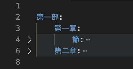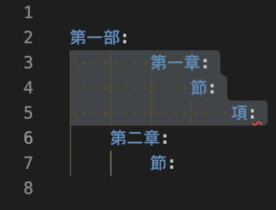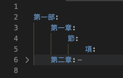 余談ですが、インデントを深くすると上記のようにエラーが赤い波線で表示されてしまいます。エラーの内容は赤い波線にマウスを合わせると表示されます。表示されるエラーは「All mapping items must start at the same column」です。インデントの位置がおかしいよというエラーです。細かく言うと、インデントの深さが深くなった最初の行のインデントの深さに後のインデントは合わせる必要があるのです。つまり、「第一章」のインデントの深さが正しい深さの位置とされ、それより浅い深さにある「第二章」は位置が間違えていると判断されてしまったからです。(「第二章」がある場所ではなく、その前の行にエラーがあるのが分かりにくいですが)