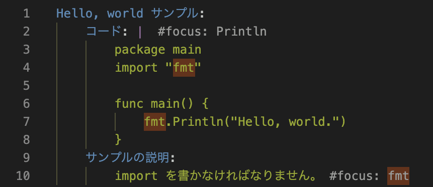Println の引数には Hello, world と書いてあるので、表示させるときはこうコーティングするのかと納得できたと思います。(この文章を書くときは、#focus: タグを適切に書いて読者に分かるようにしてください。)