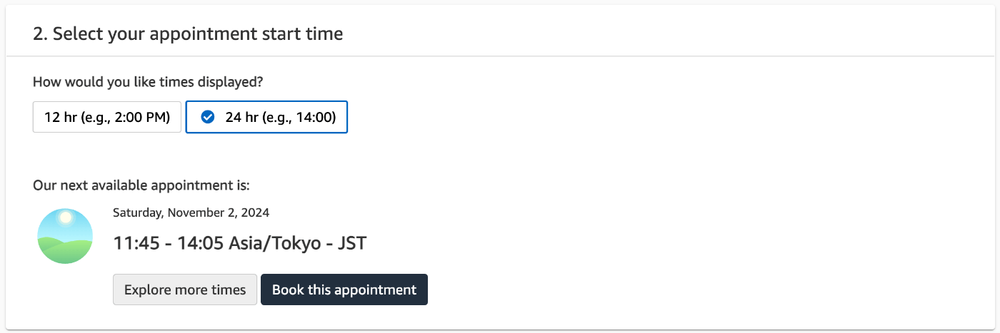 受験したい時間を選択しまして、「Book this appointment」をクリックし次に進みます