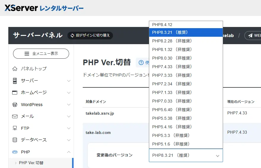 PHPは3年サイクルでサポートアウトしていくのでマメに更新しなくてはいけないのだが、WordPressやそのテーマ(Luxeritasを使っていた)も併せてバージョンアップしていかないといけない。一度今年の5月にPHP8以上にバージョンアップを試みたが、WordPressの画面でErrorかWarningはきまくりだったので断念していました(今は大丈夫そう)。