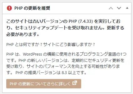 数年前に転職してからWeb開発に携わらなくなったり、新しい技術に触れる機会も減ってしまってブログネタにも困るようになり、ここ数年ブログをあまり更新してこなかったのですが、ある日WordPressの管理画面を開くと下記のようにPHPサポートアウトのお知らせが出ていました。