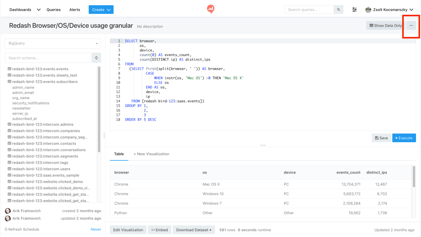 まず、RedashのダッシュボードからAPIを取得したいクエリを選択します。(画像右上の赤枠)