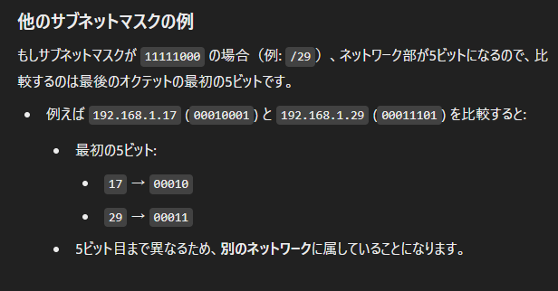 - 1の部分(ネットワーク部): 同じネットワークかどうかを判断するために使います。