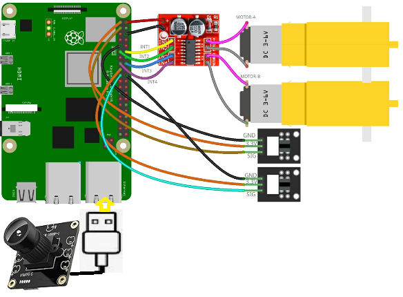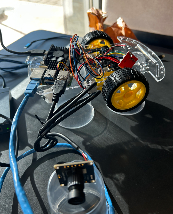 製作した全体像は以下のようです。USBのカメラもとりつけました。まだ配線をまとめたり、外付け電池をつけたり、場所の準備などができてないですがとりあえず動かせそうなとこまでできました。