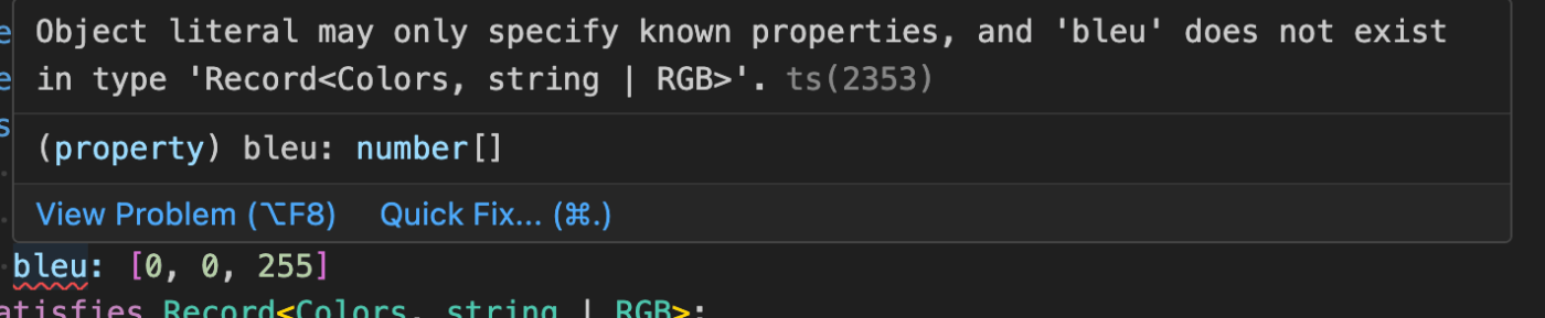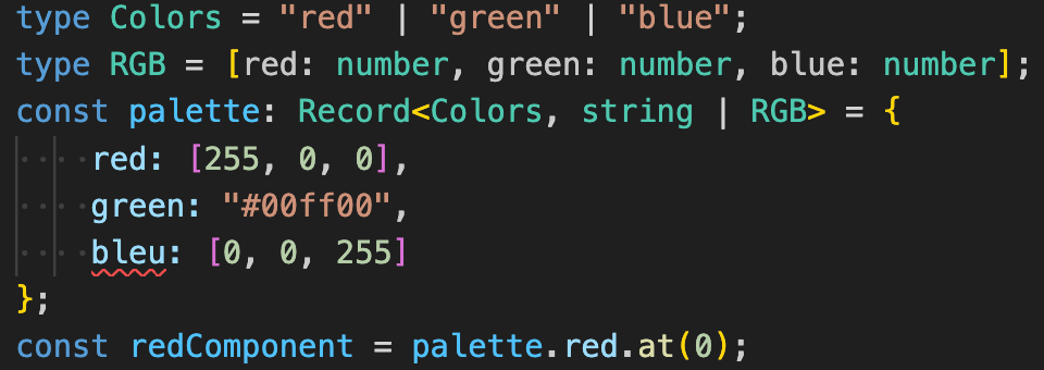 bleuと書いていますが、おそらくblueと書くべきでした。paletteに型注釈を使用してそのbleuのタイポを捕捉しようとすることもできますが、各プロパティに関する情報を失ってしまいます。