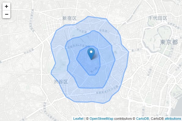 先程の例で使った神宮球場を中心として,等時線マップを描画してみましょう.コードです.デフォルトの単位は時間 (秒) らしいので,神宮球場を中心に徒歩10分・20分・30分圏を描画しました.