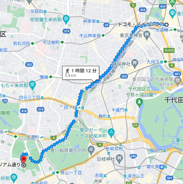 地点間の経路検索をやってみましょう.例として東京ドームの前から神宮球場まで移動する経路を探索してみます.Google Mapによれば