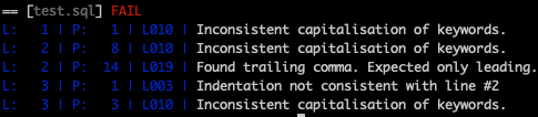 $ sqlfluff lint test.sql --rules L001,L002,L003,L010,L016,L019