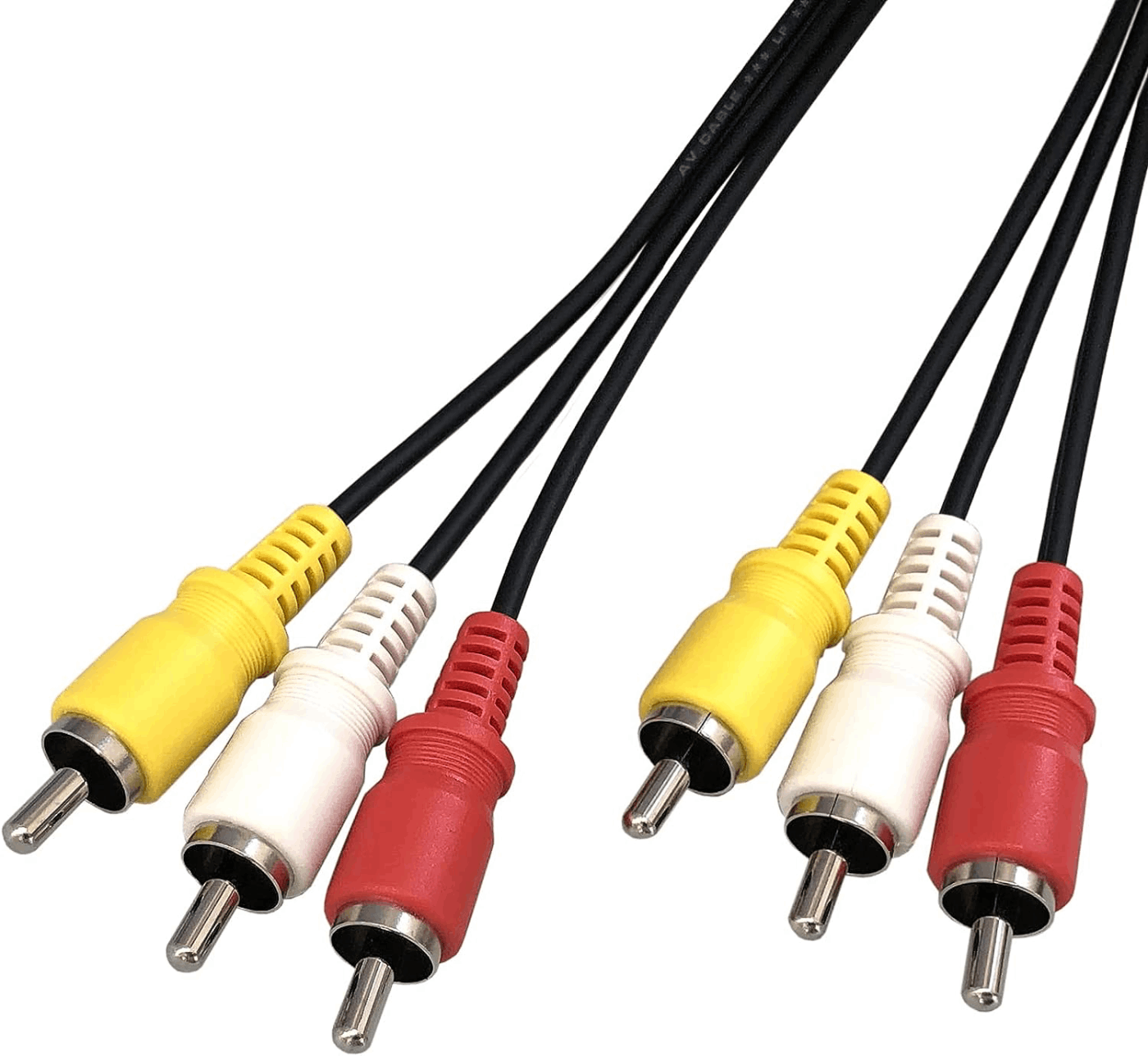 RCAケーブルはアナログテレビ時代に使われていた"いにしえの"ケーブルです。もしかしたらテレビの近くの棚とかに入っている人もいるかもしれません。このケーブルの端子は丸い金属ピンと金属リングを持った形状です。このケーブルはサブウーファーとAVアンプを接続し、アンプで増幅されていない音の電圧はけいをサブウーファーに届けます。以下の画像は3端子ですが、実際は1端子で大丈夫です(例えば黄色だけとか)。