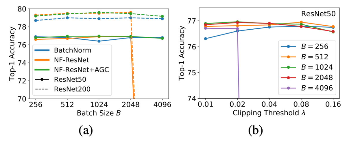 既存の BNフリーモデルであるNF-ResNetに、AGCを組み合わせた実験を行っている。AGCによって、大きなバッチサイズでも訓練が行えていることがわかった。また、