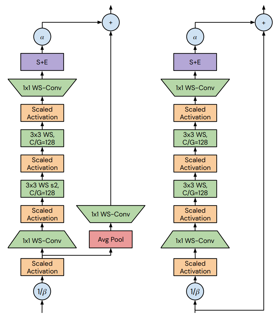 と1/\beta に該当する。\alpha - Scaled Weight Standardizationと呼ばれるConv層のパラメータに対するアフィンパラメータとバイアスパラメータ(いずれも訓練対象)を導入する。上図のWS-Convの"WS"に該当する。