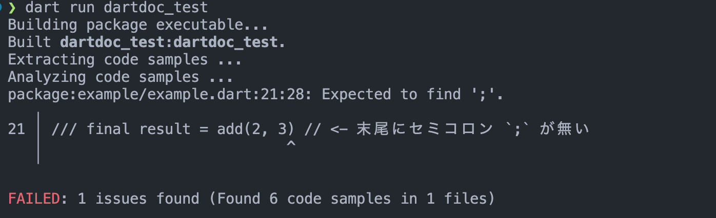 dartdoc_test パッケージを dev-dependencies に追加し、CLI から実行するとプロジェクト内のすべてのコードサンプルが extract され、コードサンプルに対して静的解析が行われます。例えば、コードサンプルにコンマをつけ忘れてしまっても、dartdoc_test ですぐにそれに気づくことができます。