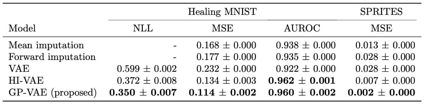 Healing MNIST ・SPRITES データに対する性能評価(出典:GP-VAE 論文 Table 1)