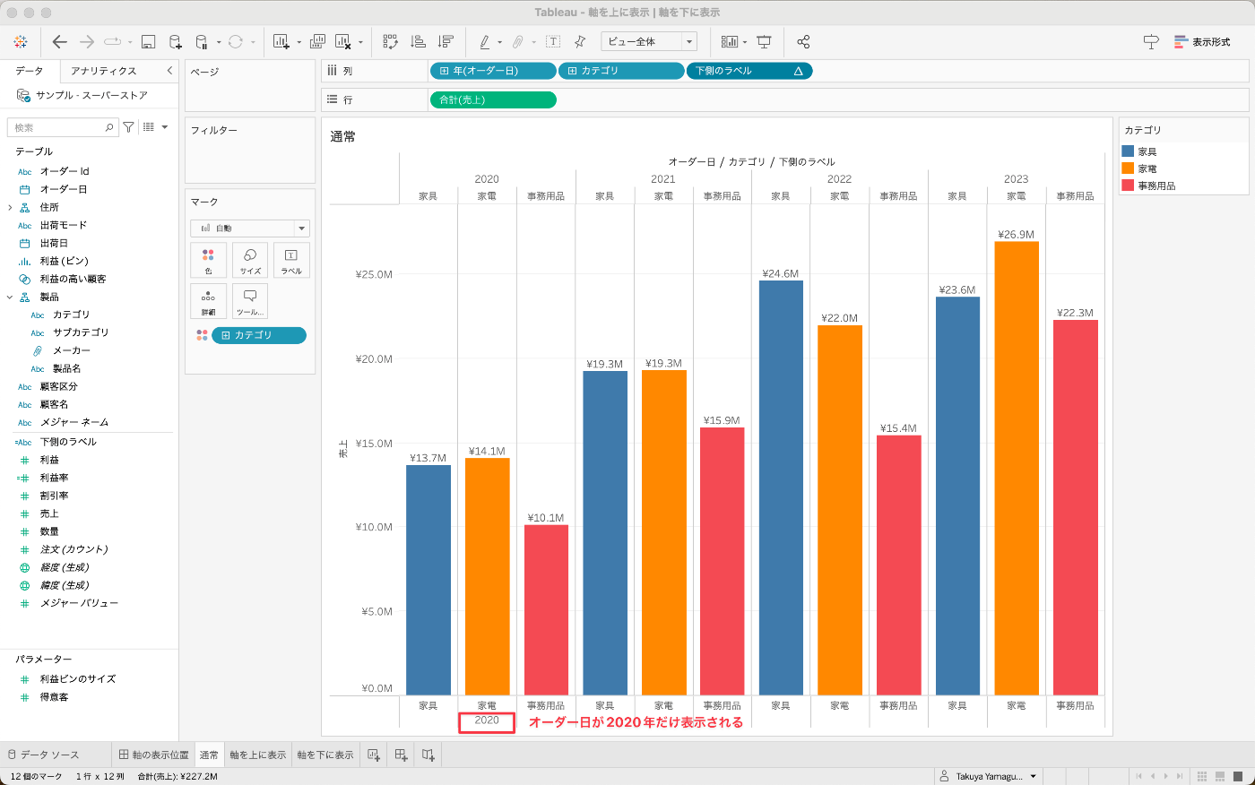 作成した計算フィールド下側のラベルを列シェルフへ入れます。すると下側に、オーダー日の2020年だけが表示されました。