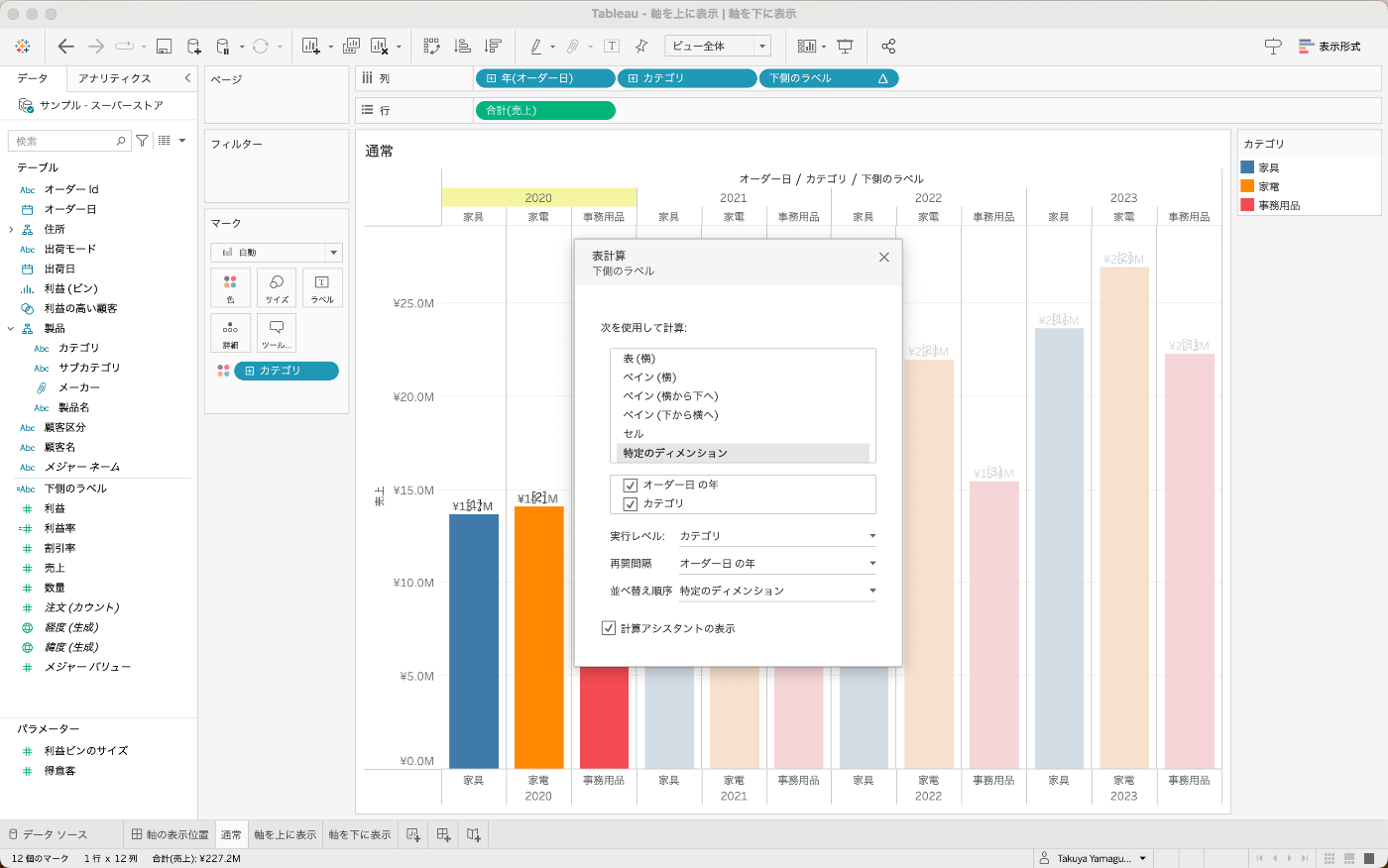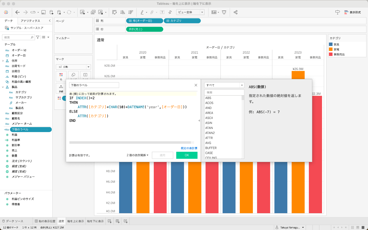 ATTR([カテゴリ]+CHAR(10)+DATENAME('year',[オーダー日]))