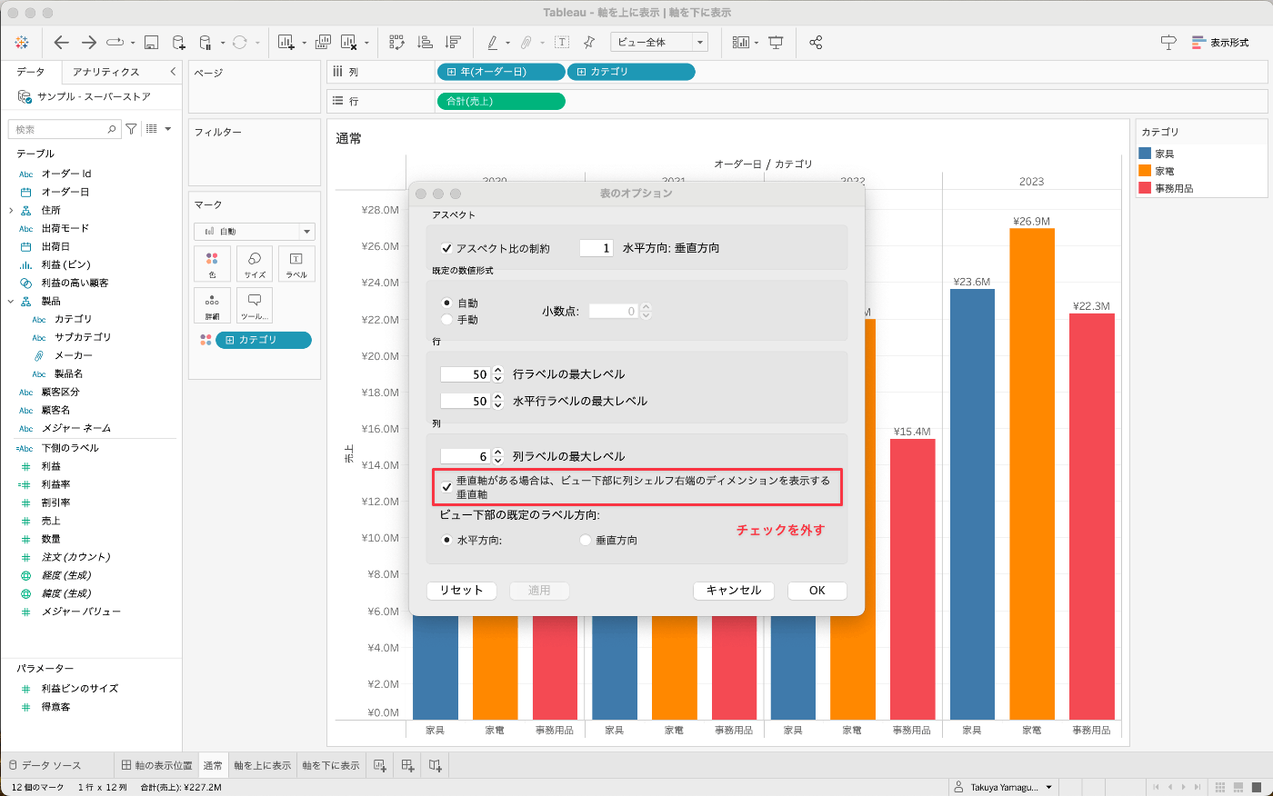 表のオプションというダイアログが表示されますので、垂直軸がある場合は、ビュー下部に列シェルフ右端のディメンションを表示する垂直軸のチェックを外します。