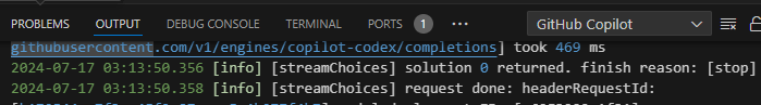 VSCodeのOutPut(Ctrl+Shift+U)を表示し、プルダウンから「Github Copilot」を選択すると、コード補完時のリクエスト、レスポンスが確認できる。