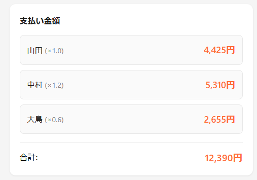 「計算する」を押すことでそれぞれの参加者の支払い金額が計算されます。
