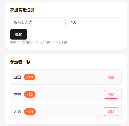 具体的には飲み会の金額と飲み会の参加者と傾斜を入力するとその人ごとの請求額が算出されるWebアプリになります。