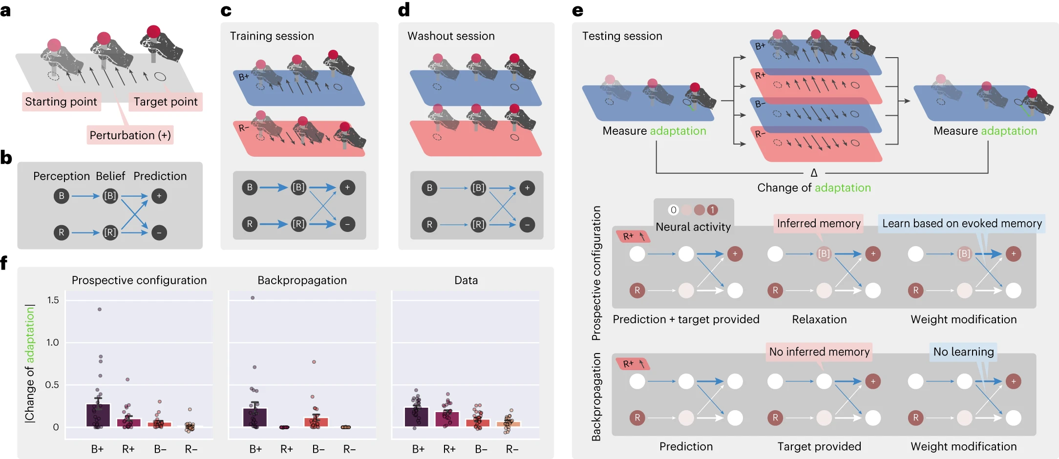 b、タスクの最小ネットワーク。背景(BおよびR)から文脈の信念([B]および[R])への関連付け、および文脈の信念から外乱の予測(+および–)への関連付けをエンコードする6つの接続が含まれます。c〜e、トレーニング(c)、ウォッシュアウト(d)、およびテスト(e)を含む、参加者が経験したセッションのシーケンス。濃い灰色のボックスは、セッション後の予想されるネットワークを示しており、太さは接続の強度を表しています。テストセッションでは、濃い色のボックスは、2つの学習規則がR+トライアルでどのように異なる方法で学習するかを説明しており、fの違いにつながります。f、人間の参加者から測定された行動データと比較した2つの学習規則の予測。見込み構成はデータの主要なパターンを再現しますが、バックプロパゲーションはそうではありません。行動実験には24人の参加者がいたため、各実験はn = 24のランダムシードで繰り返されました。