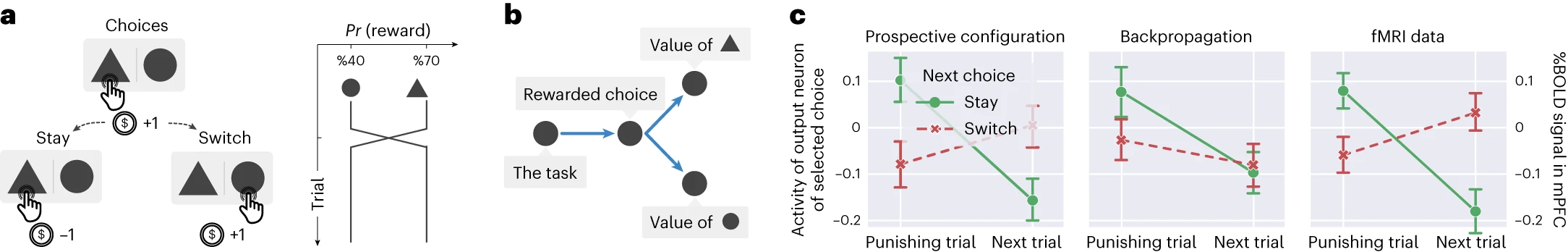 a、強化学習タスク。人間の参加者は、異なる確率で報酬(コインを獲得)または罰(コインを失う)につながる2つのオプションから選択する必要がありました。報酬の確率は、2つのオプション間で時々逆転しました。b、タスクの重要な要素をエンコードする最小ネットワーク。c、見込み構成およびバックプロパゲーションでトレーニングされたネットワークからの、選択されたオプションに対応する出力ニューロンの活動。人間の参加者で測定されたfMRIデータ(つまり、mPFCのピーク血中酸素レベル依存(%BOLD)信号)と比較されます。見込み構成は、罰トライアル後の次の選択が他のオプションに切り替える場合、期待値(mPFCの%BOLD信号でエンコード)が増加するという重要な発見を再現します。トライアルの数は元の論文に記載されていないため、両方の学習規則についてn = 128トライアルをシミュレートしました。エラーバーは、68%の信頼区間を表しています。