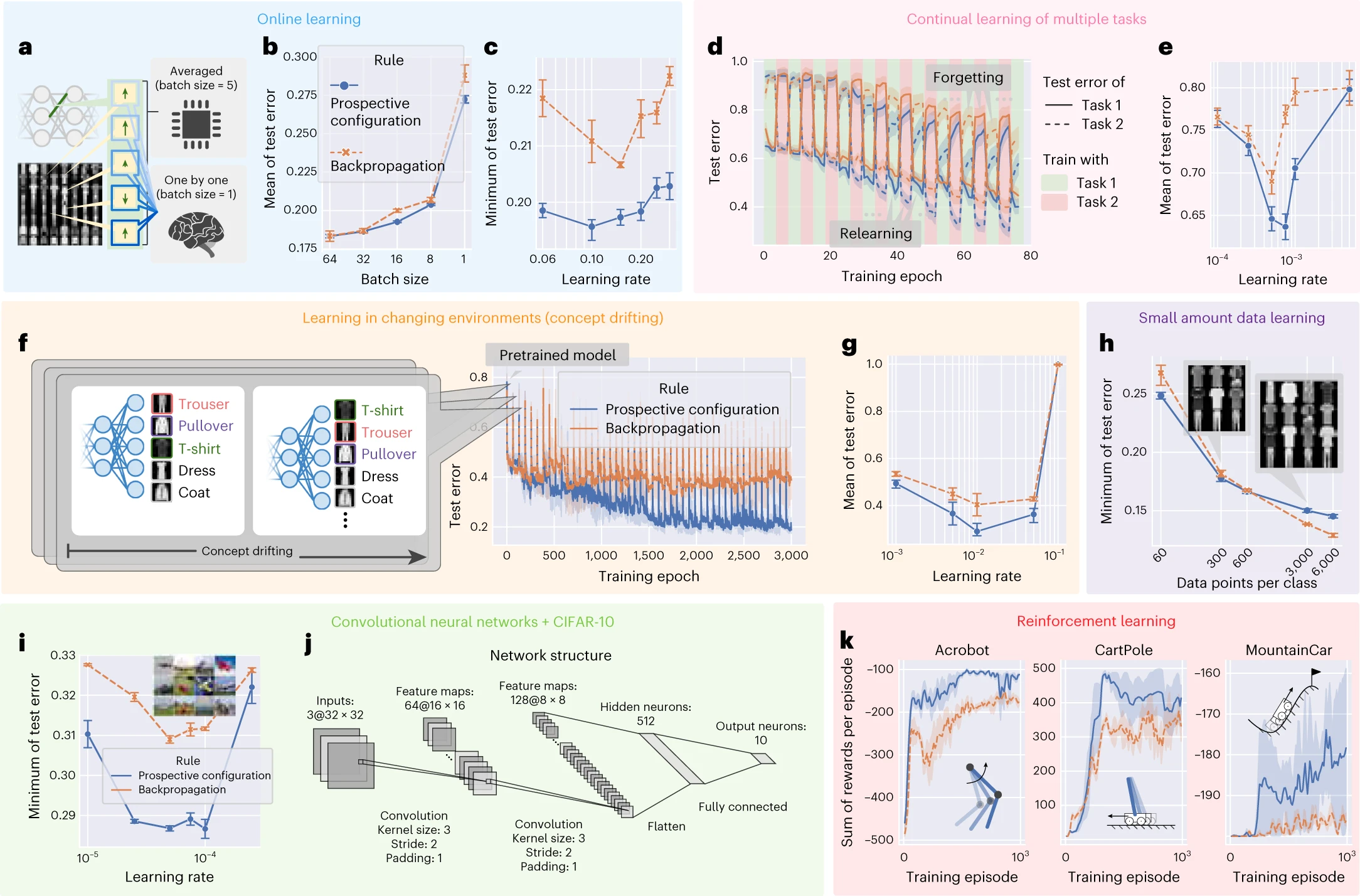 a〜k、学習状況には、オンライン学習[^29](a〜c)、複数のタスクの継続的な学習[^30](d〜e)、変化する環境での学習[^31](f〜g)、限られた量のトレーニング例での学習(h)、および強化学習[^4](k)が含まれます。各状況に対応するグラフは、同じ背景色でグループ化されています。各状況のシミュレーションは、メソッドで説明されている「デフォルト設定」とは、このタスクに固有の単一の側面が異なります。たとえば、デフォルト設定にはミニバッチでのトレーニングが含まれているため、オンライン学習を調査するためにa〜cでのみバッチサイズが1に設定されましたが、残りのグループではより大きなデフォルト値に設定されました。教師あり学習の設定では、完全に接続されたネットワーク(a〜h)はFashionMNIST[^60]データセットで評価され、畳み込みニューラルネットワーク[^35](iおよびj)はCIFAR-10(参考文献36)データセットで評価されました。強化学習の設定(k)では、完全に接続されたネットワークが3つの古典的な制御問題で評価されました。学習率が表示されていない場合、プロット内の各ポイント(実験の設定)は、その設定で各ルールに対して独立して最適化された最適な学習率に対応します。a、個々の例に対する荷重修正を平均して「統計的に優れた」値を取得できるコンピュータと、別の計算を行う前に1つの修正を適用する必要がある生物学的システムとの間のトレーニング設定の違い。b、バッチサイズの関数としてのトレーニング中のテストエラーの平均。c、学習率の関数としてのトレーニング中のテストエラーの最小値。d、2つのタスクの継続的な学習中のテストエラー。e、学習率の関数としてのトレーニング中の両方のタスクのテストエラーの平均。f、概念ドリフトで学習する場合のトレーニング中のテストエラー。g、学習率の関数としての概念ドリフトでのトレーニング中のテストエラーの平均。h、異なる量のトレーニング例(クラスごとのデータポイント)でのトレーニング中のテストエラーの最小値。i、CIFAR-10(参考文献36)データセットで、見込み構成とバックプロパゲーションでトレーニングされた畳み込みニューラルネットワークのトレーニング中のテストエラーの最小値。j、iで使用される畳み込みニューラルネットワークの構造の詳細。k、3つの古典的な強化学習タスク(インセット)でのトレーニング中のエピソードごとの報酬の合計。エピソードは、環境の初期化から終了状態に到達するまでの期間です。a〜hの各実験は、n = 10のランダムシードで繰り返されました。i〜kの各実験は、これらの実験はより高価であるため、n = 3のランダムシードで繰り返されました。エラーバーとバンドは、68%の信頼区間を表しています。