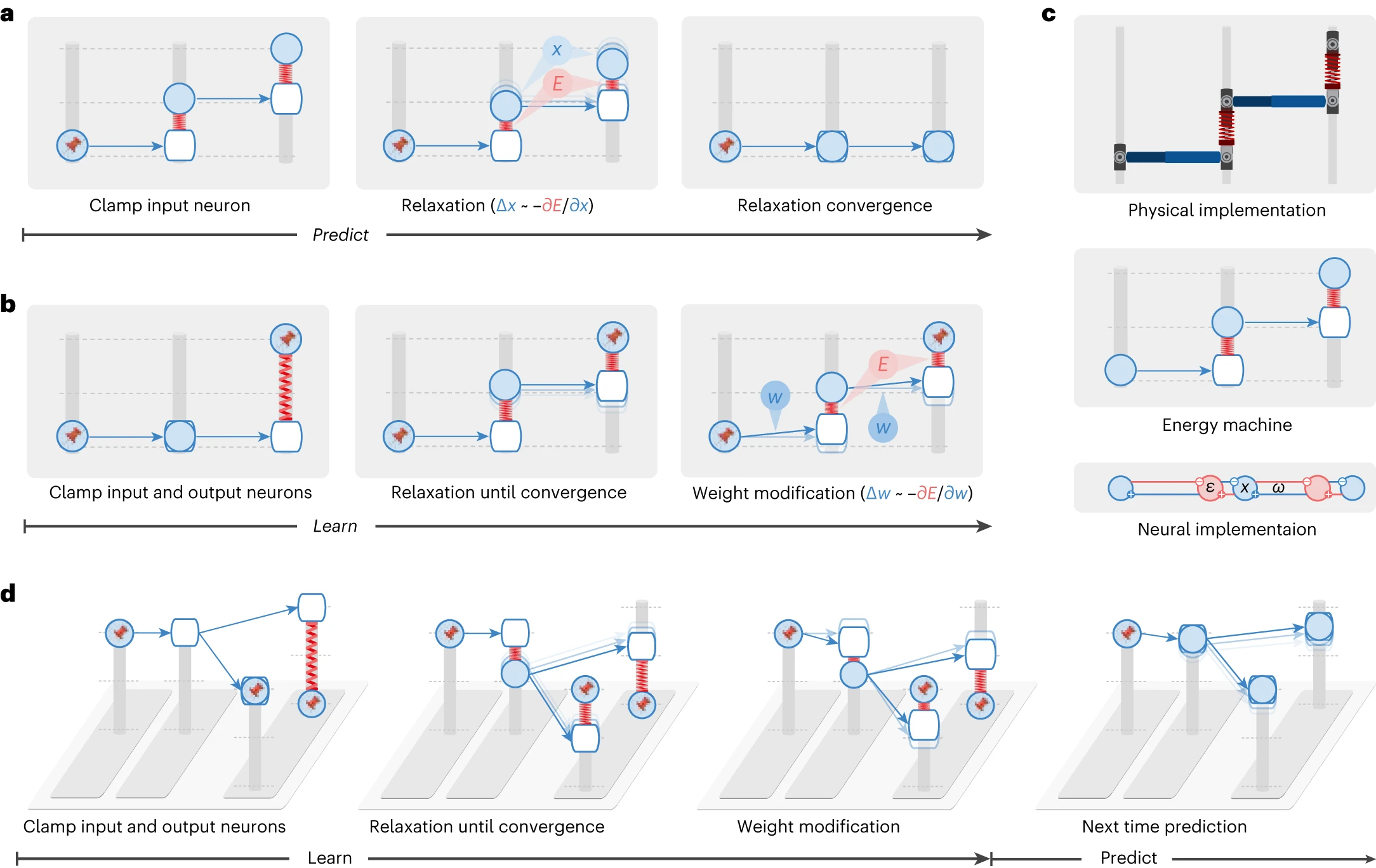 エネルギー関数を最小化することによって駆動されるエネルギーベースのネットワークのダイナミクスは、スプリング上の合計弾性ポテンシャルエネルギーを削減することによって駆動されるエネルギー機械の緩和にマップされます。エネルギーベースのネットワークによる予測には、入力ニューロンを提供された刺激に固定し、他のニューロンの活動を更新することが含まれます。これは、エネルギー機械の片側を固定し、ノードを移動させてエネルギー機械を緩和させることに対応します(図2a)。エネルギーベースのネットワークによる学習には、入力ニューロンと出力ニューロンを対応する刺激に固定し、最初に残りのニューロンの活動を収束させ、次に荷重を更新することが含まれます。これは、エネルギー機械の両側を固定し、最初にノードを移動させてエネルギー機械を緩和させ、次にロッドを調整することに対応します(図2b)。