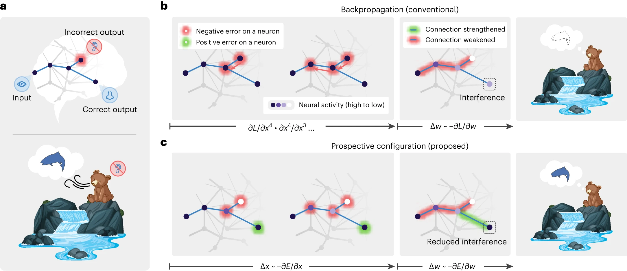 b,c, バックプロパゲーションは学習中に干渉を引き起こします。水の音を聞かないことは、鮭の匂いを嗅ぐという期待を減らします(b)。ただし、鮭の匂いは実際に嗅ぎました。一方、展望的構成はそのような干渉を回避します(c)。バックプロパゲーションでは、負のエラーがエラー出力から隠れニューロンに伝播します(b; 左)。これにより、一部の接続が弱まり、次の試行では不正解の出力が改善されますが、正解の出力の予測も減少し、干渉が発生します(b; 中央と右)。展望的構成では、荷重修正の前に神経活動が新しい構成(紫色の強度が異なる)に落ち着きます(c; 左)。この構成は、学習後に生成されるはずの活動に対応します。つまり、「展望的」です。したがって、正しい出力に対する正のエラーを予見し、不正解の出力を改善しながら、正しい出力を維持するように接続を修正します(c; 中央と右)。