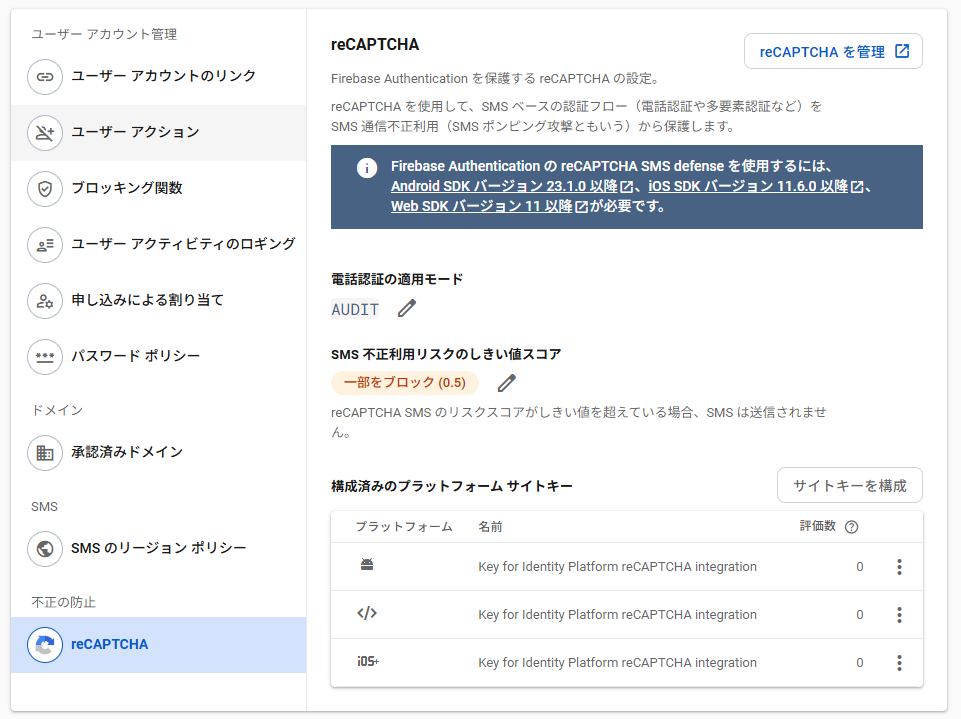 - reCAPTCHA認証:SMSの送信前にreCAPTCHA認証が必要です。