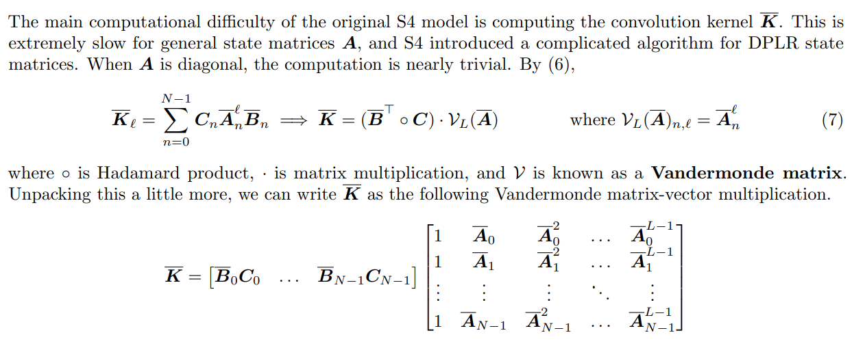 S4では行列AがDPLR(Diagonal Plus Low-Ran)形式で記述できる事で、カーネルの計算を簡略化できていました。改めて式を記述すると以下になります。