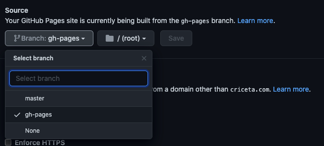 最後に、GitHub リポジトリの Settings で gh-pages ブランチを GitHub Pages に公開する設定をすれば完了です。