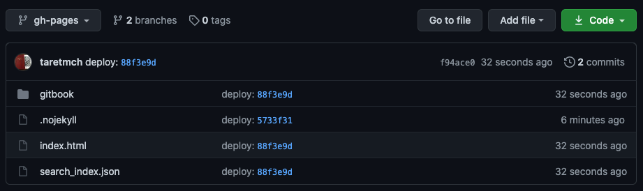gh-pages ブランチを確認してみると、Honkit で生成したファイルが作られていることがわかります。