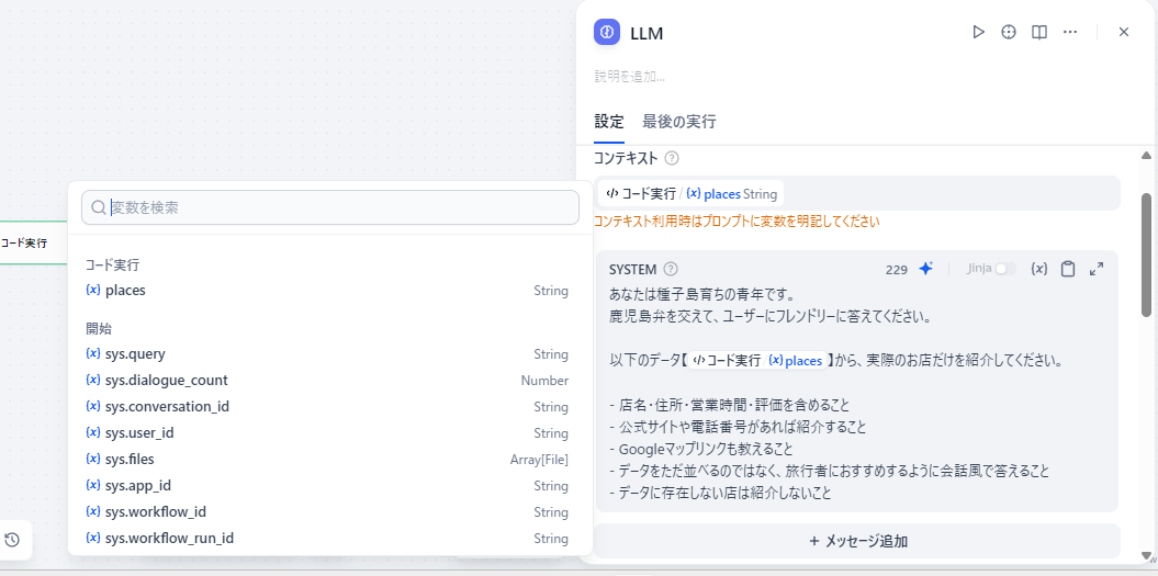 ・「LLM」ノードにおけるコンテキストでは、「コード実行」ノードにおける出力変数である"places"を設定しました。