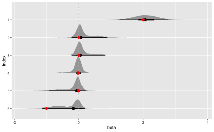 この場合では Stan コードのコンパイルが成功し実行はできたものの、回帰係数の大きさが